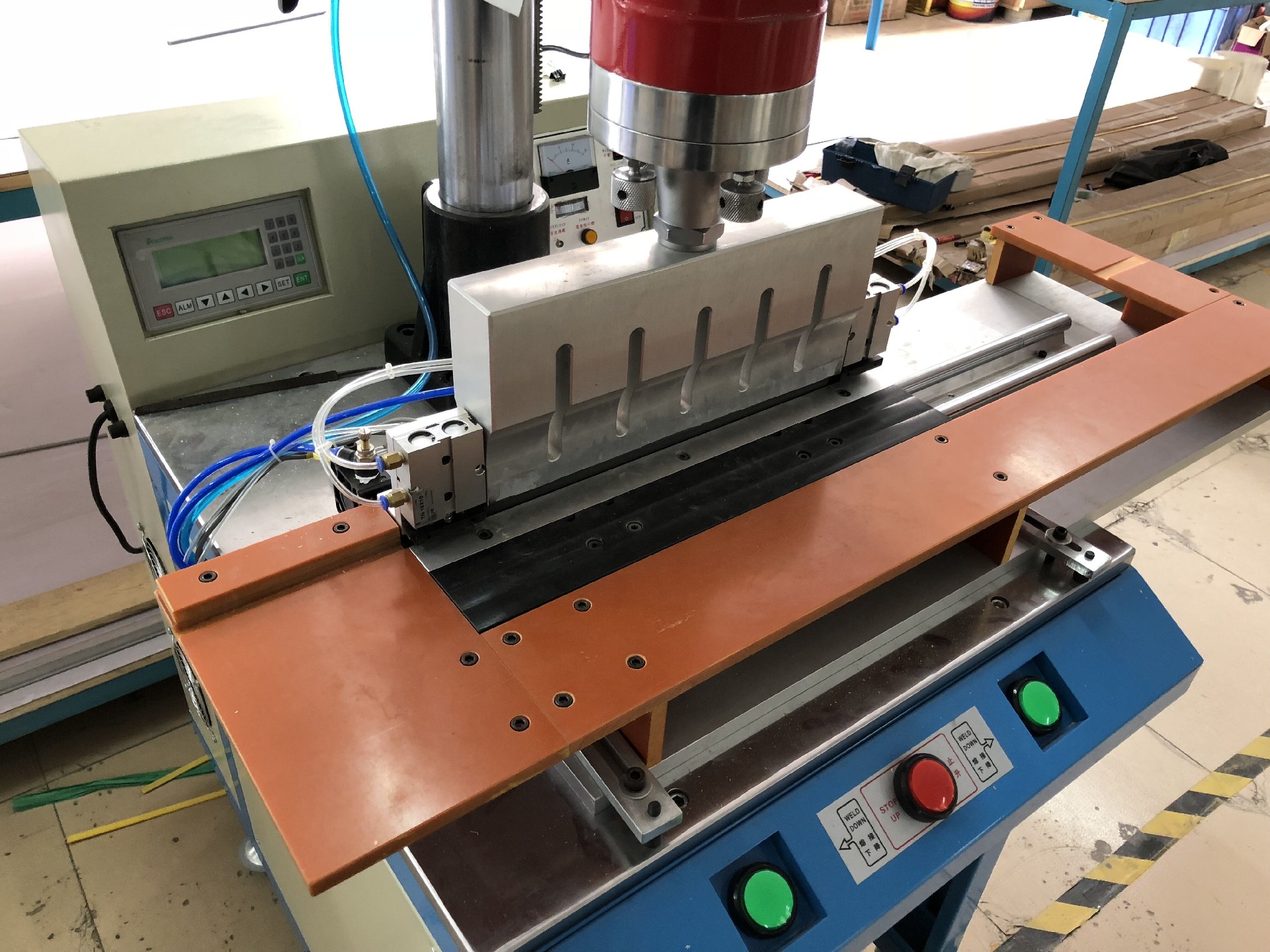 9.机器采用PLC控制。采用气缸送料,保证送料精度;采用分段压合,总长度根据产品需要,设置压合次数,每次压合长度400mm