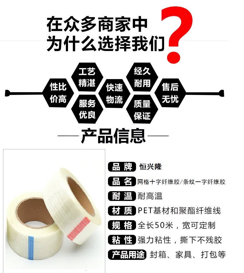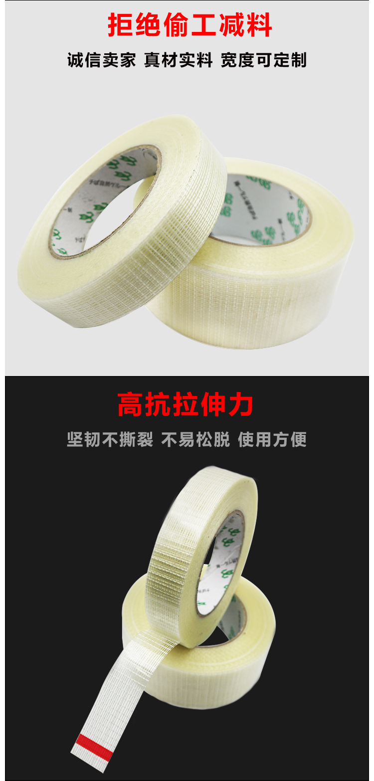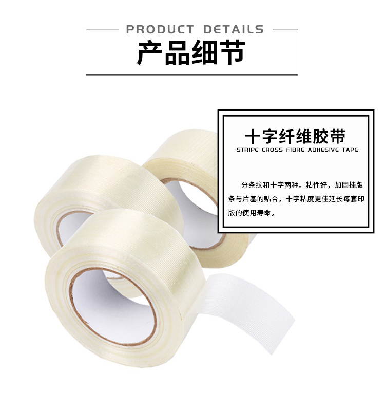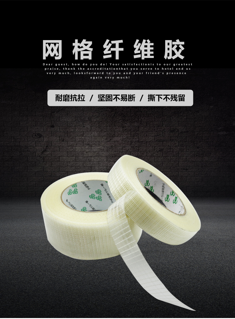 挂版纤维胶带介绍:由高强度的玻璃纤维纱或布为强化背材复合聚酯(PET film)薄膜,单面涂覆强粘力压敏胶粘剂而成,胶带张力强度极高,具有高度的耐磨性能及抗潮能力和超强的抗拉力,不留残胶。胶带根据玻璃纤维的排列,有一字和十字两种类型;